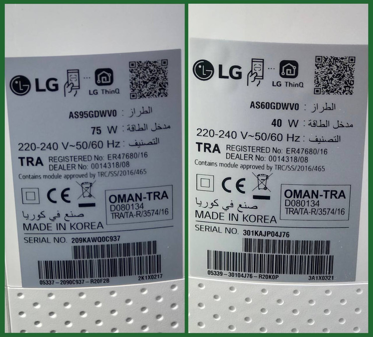 *آزمایش توسط آزمایشگاه داخلی LG و KIMM (مؤسسه ماشینآلات و تولیدات کره): PuriCare AS281DAW