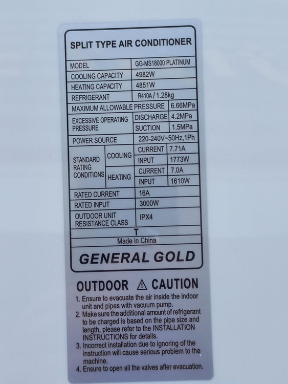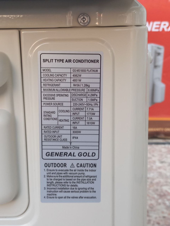 مشخصات فنی کولر گازی جنرال گلد GG-MS18000 PLATINUM